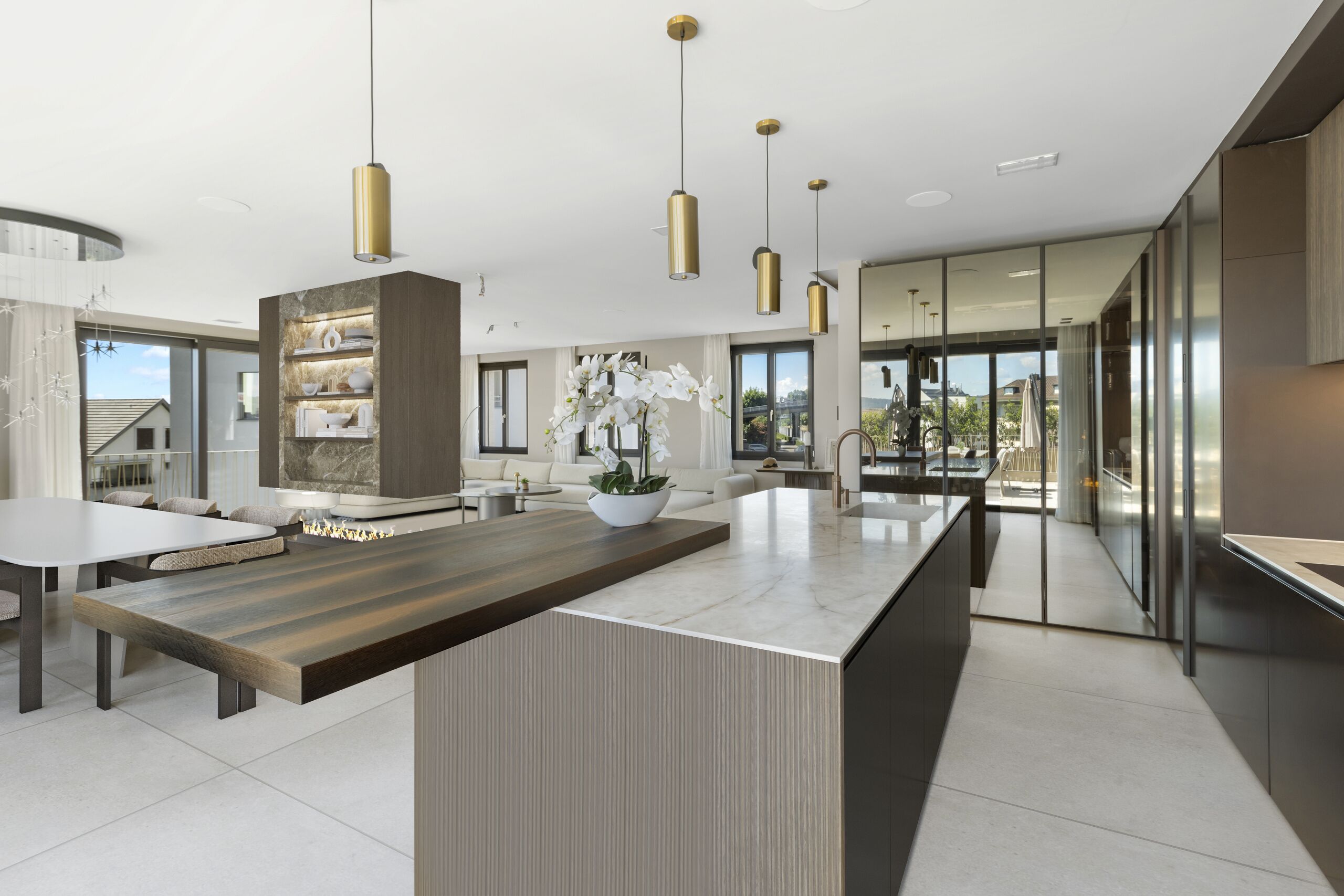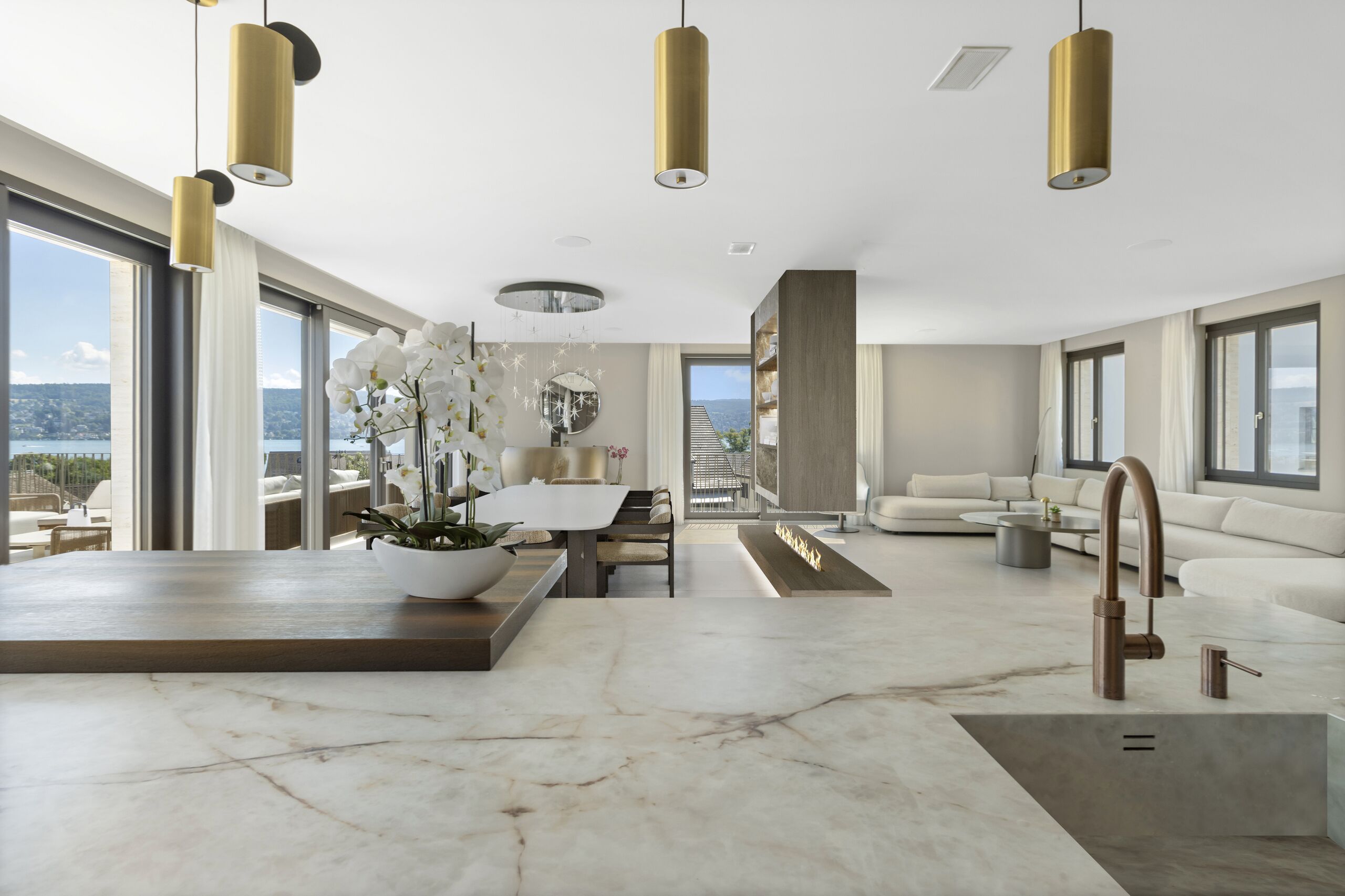 The top floor forms the heart of the house. The open-plan living and dining area with ethanol fireplace and integrated TV wall opens onto the spacious terrace with unobstructed views of Lake Zurich. The kitchen is a design highlight and combines functionality with aesthetics. The panoramic view of Lake Zurich and the Alpine backdrop make this level a unique place for relaxation and representation.